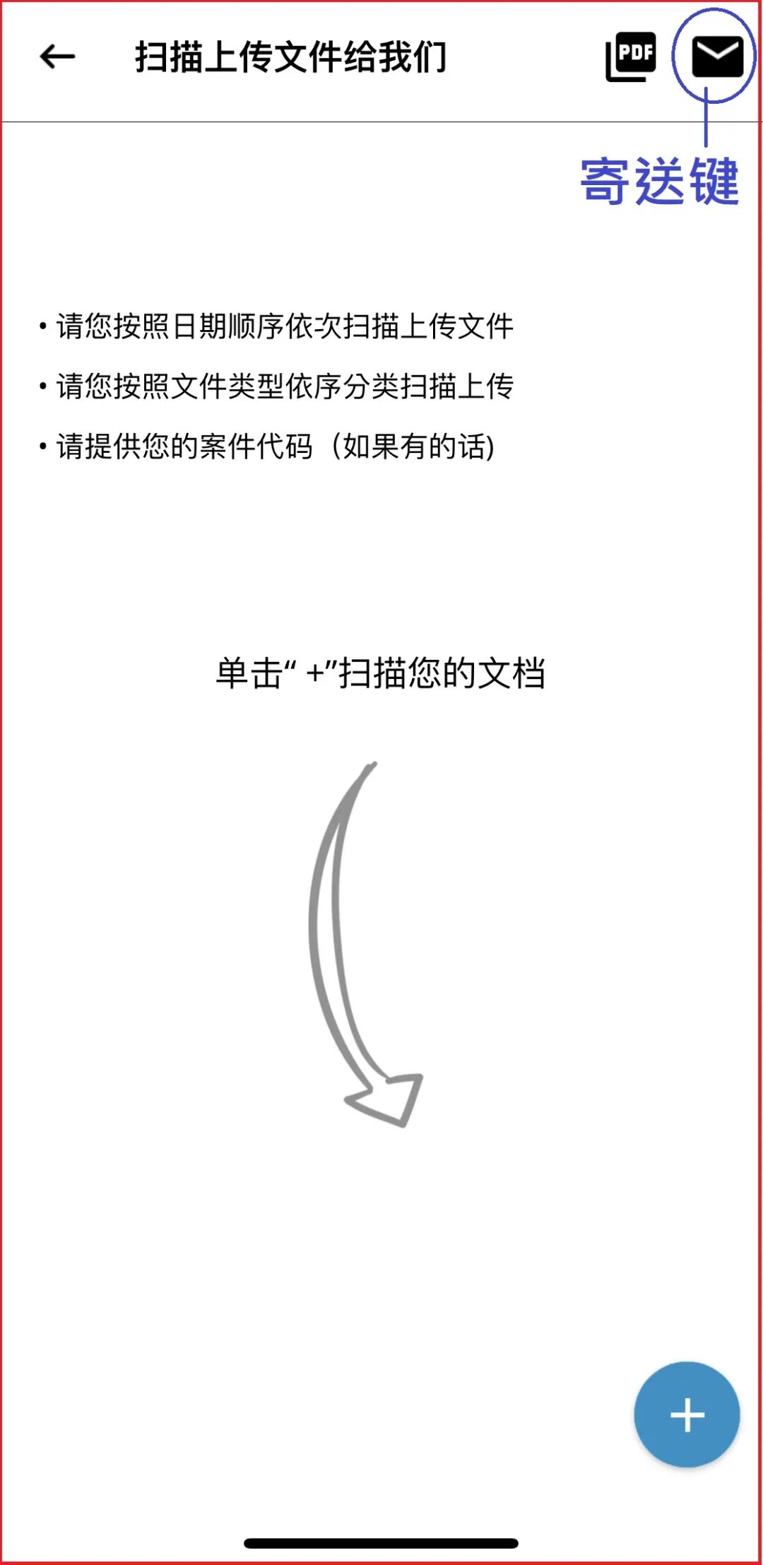 首先,莎粉们只需要在主页菜单点选“扫描上传文件给我们”,点进去后照着页面的指示,点选右下角“+”来开启手机的相机功能,就可以通过App来拍摄/扫描您想传给我们的文件。