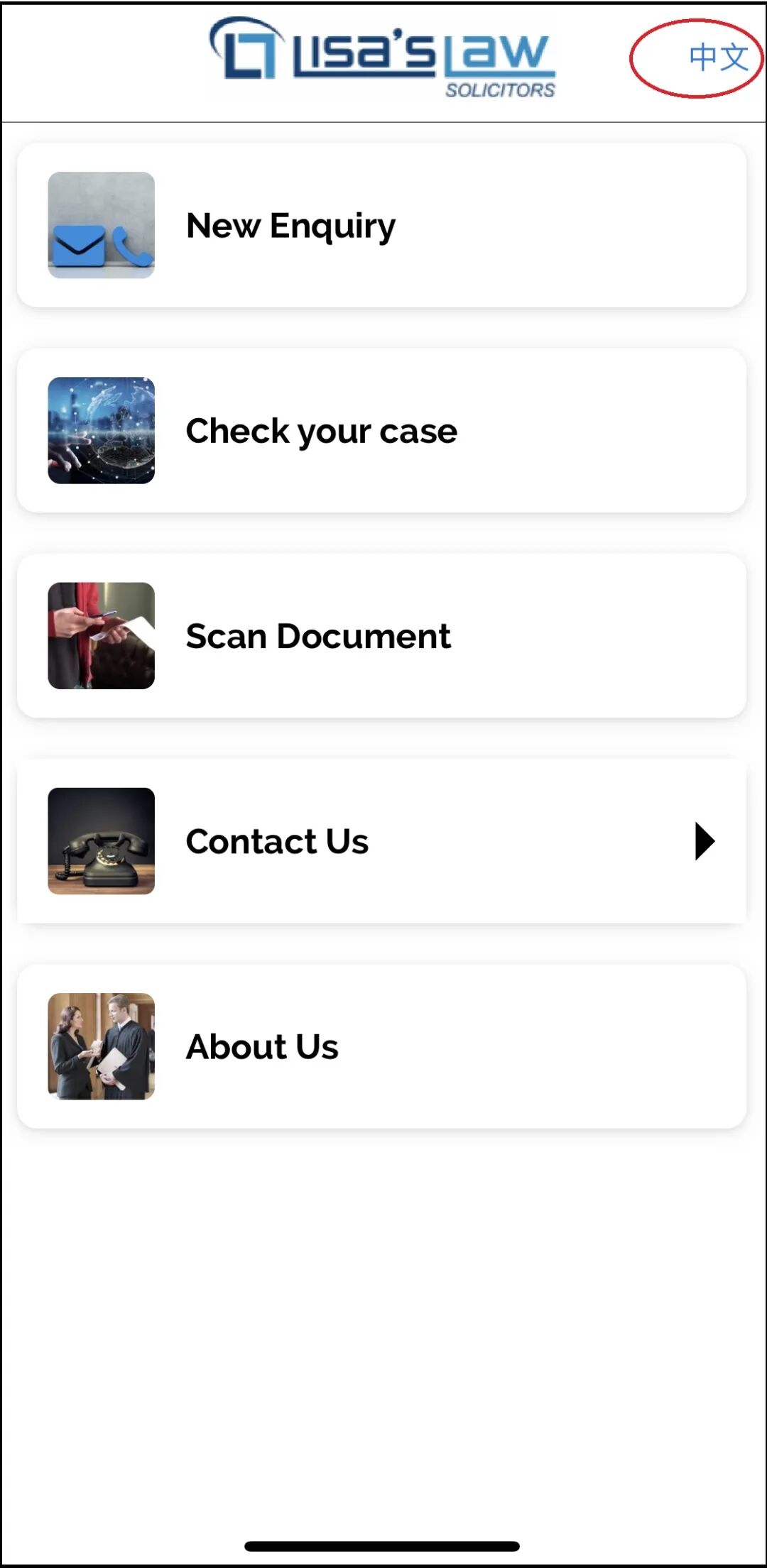 下载后,打开丽莎律师行(Lisa’s Law)的App,您就会看到App的首页菜单页面,您可以直接从这边点选您想要的操作,像是选择委托丽莎/咨询丽莎,或者如果您已经是我们的客户,您还能直接线上登录查询您的案件进度,甚至把案件相关文件通过App发送给我们。